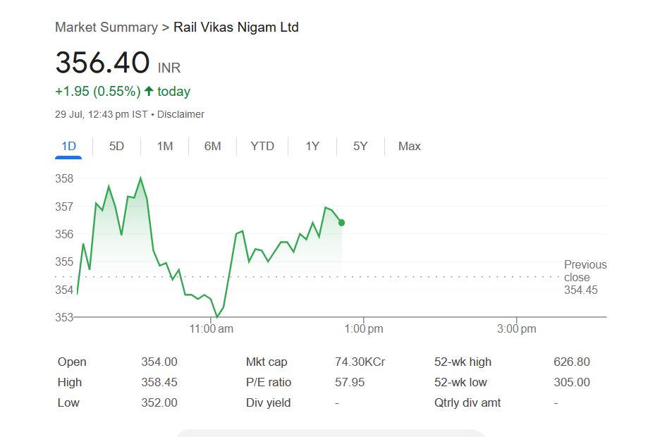 - RVNL का शेयर 0.55% चढ़कर ₹356.40 पर कारोबार करता दिखा।