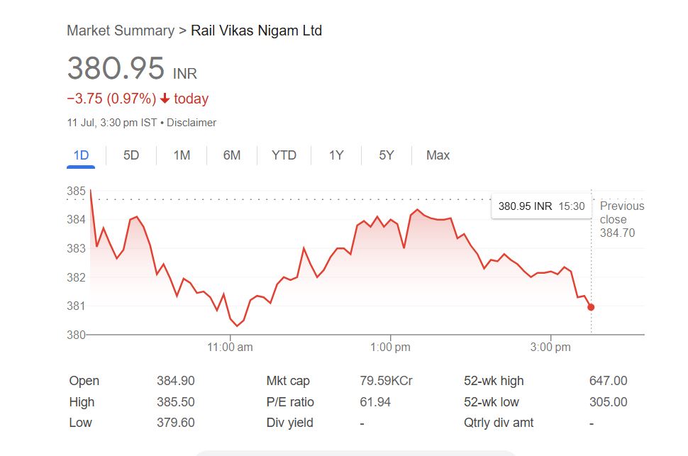 RVNL Share Price: शुक्रवार, 11 जुलाई 2025 को रेल विकास निगम लिमिटेड (RVNL) के शेयर में मामूली गिरावट दर्ज की गई। यह शेयर -0.97% की गिरावट के साथ 380.95 रुपये पर बंद हुआ। दिनभर के कारोबार सत्र में इसने 384.90 रुपये पर ओपनिंग हुई थी और दिन के 385.50 रुपये के हाई लेवल को छुआ, जबकि लो लेवल 379.60 रुपये रहा। बाजार में हलचल के बावजूद, इस शेयर पर निवेशकों की अच्छी दिलचस्पी बनी हुई है।