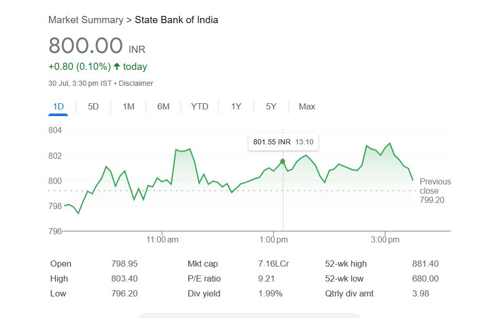 - SBI का शेयर आज ₹800 पर मामूली तेजी के साथ ट्रेड कर रहा है