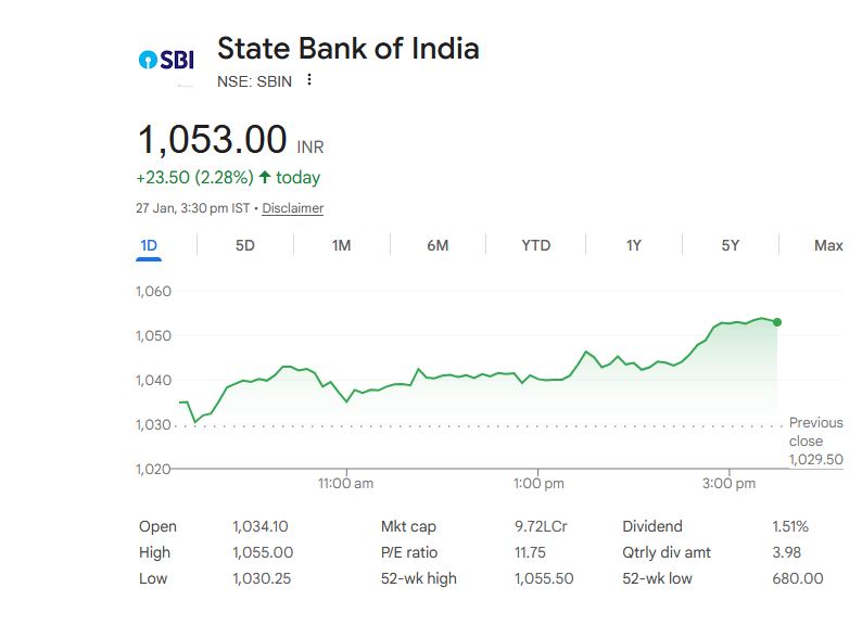 - SBI शेयर: आज 1053 रुपये पर बंद, 2.28% तेजी।