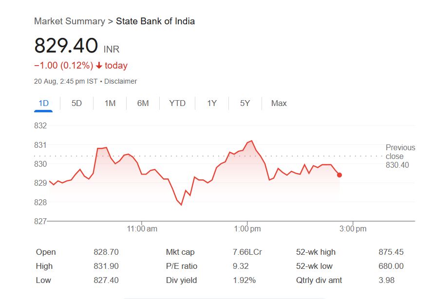SBI Bank Share Price: बुधवार, 20 अगस्त 2025 दोपहर 2.45 बजे तक स्टॉक मार्केट बीएसई का 30 शेयरों वाला संवेदी सूचकांक करीब 290.99 अंक या 0.36 प्रतिशत उछलकर 81,935.38पर पहुंच गया। वहीं, एनएसई निफ्टी 89.20 अंक या 0.36 प्रतिशत बढ़कर 25,069.85 पर कारोबार कर रहा है। लेकिन, बाजार में तेजी के बावजूद स्टेट बैंक ऑफ इंडिया लिमिटेड कंपनी के शेयर में गिरावट देखने को मिली।