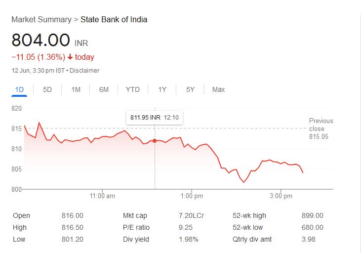 - SBI का शेयर आज 804 रुपये पर 1.36% गिरकर बंद हुआ।