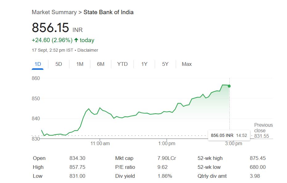 - एसबीआई के शेयर ₹856.15 पर पहुंचे।