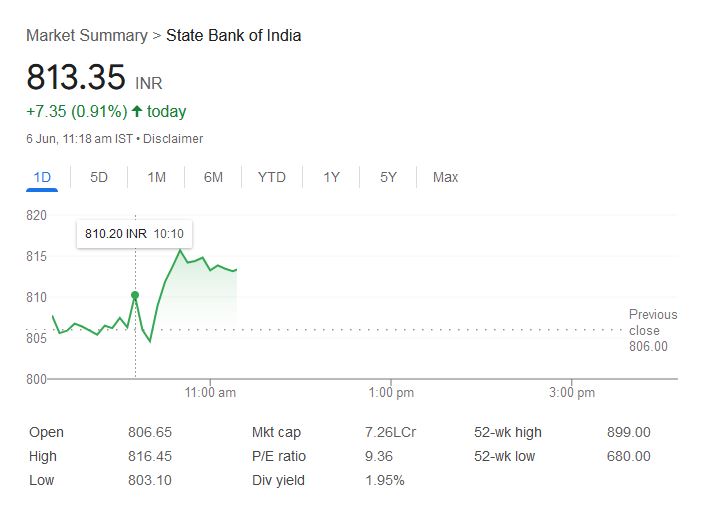 - SBI का शेयर आज 813.35 रुपये पर 0.91% की तेजी के साथ ट्रेड कर रहा है।