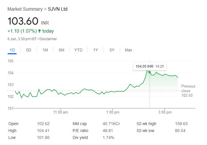 - एसजेवीएन का शेयर आज 1.07% बढ़कर 103.60 रुपये पर ट्रेड कर रहा है।