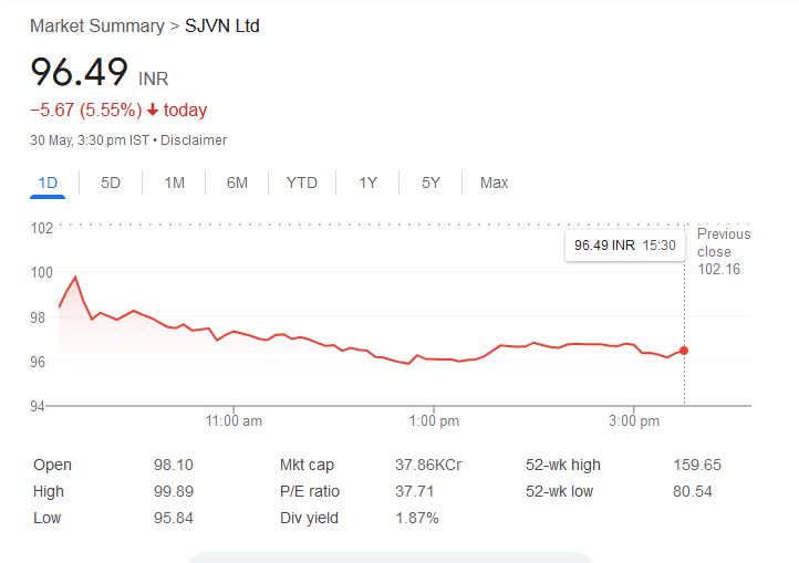 - SJVN का शेयर 5.55% टूटकर 96.49 रुपये पर बंद।