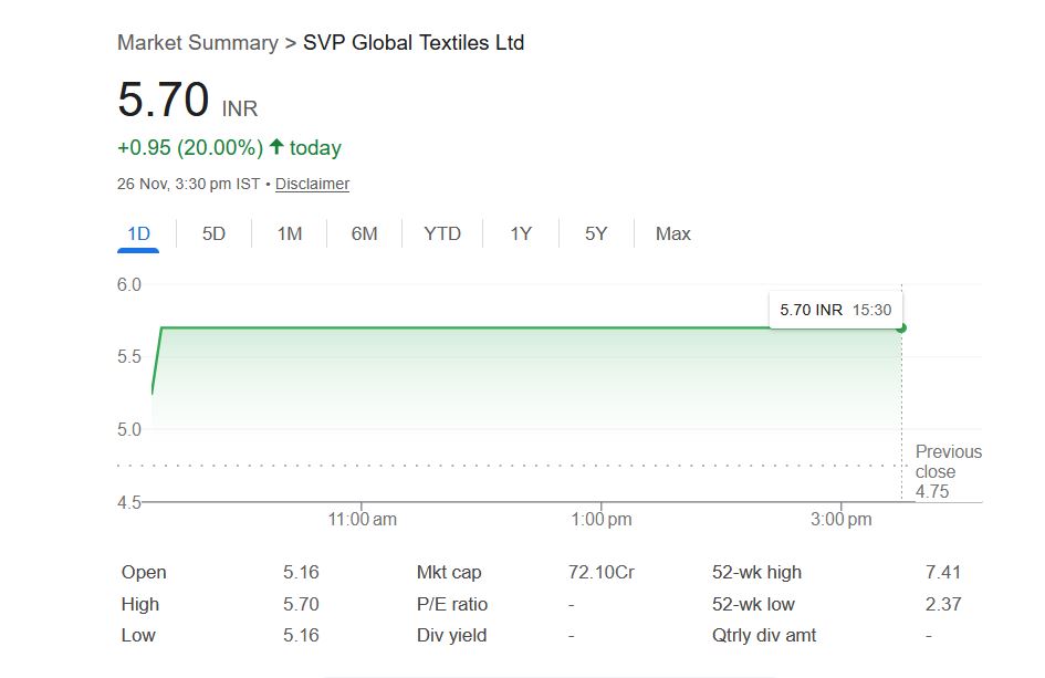 शेयर बाजार में 10 रुपये से कम कीमत वाले SVP Global Textiles के शेयरों में आज 20% की तेजी आई। बुधवार को कंपनी के शेयर बीएसई में 5.16 रुपये के स्तर पर खुले और दिनभर तेजी के साथ निवेशकों में उत्साह देखा गया।