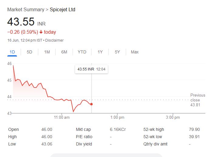 Spicejet Share: सोमवार को जब शेयर बाजार खुला, तो स्पाइसजेट के शेयरों में शानदार बढ़त देखने को मिली। शुरुआती कारोबारी सत्र में कंपनी के शेयरों में करीब 5% की छलांग देखी गई। यह उछाल ऐसे समय में आया जब बाकी मार्केट स्थिर था। लेकिन जैसे ही broader बाजार में रौनक बढ़ी, स्पाइसजेट का स्टॉक धीरे-धीरे फिसलता चला गया और सुबह की सारी बढ़त खो बैठा। दोपहर करीब 12:05 बजे यह गिरकर 43.55 रुपये के स्तर पर ट्रेड कर रहा था।