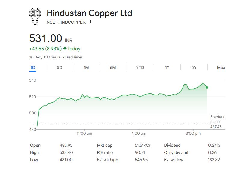 Hindustan Copper Share: हिंदुस्तान कॉपर लिमिटेड के शेयरों ने मंगलवार, 30 दिसंबर को लगातार आठवें दिन जोरदार तेजी दिखाई। शुरुआती कारोबार के घंटों में ही शेयर लगभग 7% उछलकर 531 रुपये पर बंद हुआ। वर्ष 2025 में अब तक शेयरों में लगभग 110% की वृद्धि दर्ज की गई है। इस रैली ने निवेशकों को भरोसा और राहत दोनों दी।