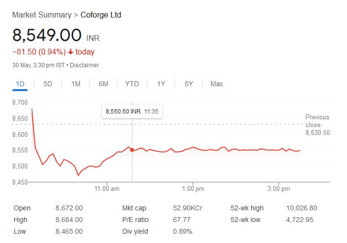 कोफोर्ज लिमिटेड का शेयर शुक्रवार, 31 मई 2025 को 8551.10 रुपये पर बंद हुआ। बीते एक साल में इसमें 71% की तेजी आई है। पिछले 10 वर्षों में इस शेयर ने 2132% का शानदार रिटर्न दिया है।