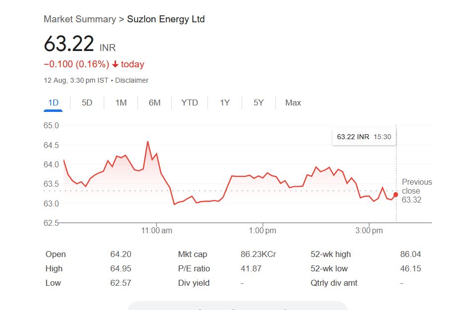 मंगलवार, 12 अगस्त 2025 को सुजलॉन एनर्जी लिमिटेड कंपनी का शेयर 0.16% फिसलकर 63.22 रुपये पर ट्रेड करते हुए बंद हुआ। आज सुबह शेयर बाजार में ट्रेडिंग शुरू होते ही सुजलॉन एनर्जी शेयर 64.20 रुपये पर खुला था। जो आज दोपहर 3.30 बजे तक सुजलॉन एनर्जी कंपनी शेयर का इंट्रा-डे हाई-लेवल 64.95 रुपये और लो-लेवल 62.57 रुपये था।