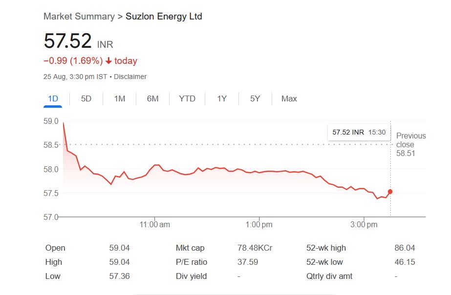 सोमवार, 25 अगस्त 2025 के दिन सेंसेक्स-निफ्टी में उतार चढ़ाव के बीच सुजलॉन एनर्जी लिमिटेड कंपनी का शेयर 57.52 रुपये पर कारोबार कर रहा है। पिछला क्लोजिंग प्राइस 58.51 रुपये के स्तर से शेयर -1.69 प्रतिशत की गिरावट के साथ ट्रेड कर रहा है। सोमवार को सुबह स्टॉक मार्केट में ट्रेडिंग शुरू होते ही सुजलॉन एनर्जी शेयर 59.04 रुपये पर खुला था। जो आज दोपहर 3.30 बजे तक सुजलॉन एनर्जी कंपनी शेयर ने दिन के 59.04 रुपये के हाई लेवल को छुआ। वहीं, इस शेयर का लो-लेवल 57.36 रुपये था।
