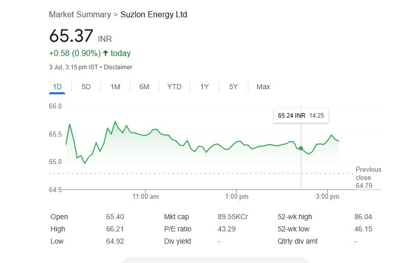 Suzlon Share Price: आज, गुरुवार, 3 जुलाई 2025 के दिन भारतीय शेयर में सकारात्मक रूझान के बीच सुजलॉन एनर्जी लिमिटेड कंपनी का स्टॉक 0.90% चढ़कर 65.37 रुपये पर कारोबार कर रहा हैं। गुरुवार को सुबह स्टॉक मार्केट में ट्रेडिंग शुरू होते ही सुजलॉन एनर्जी शेयर 65.40 रुपये पर ओपन हुआ था। आज दोपहर 3.15 PM तक सुजलॉन एनर्जी कंपनी शेयर ने दिन के 66.21 रुपये के हाई लेवल को छुआ। वहीं, इसका लो-लेवल 64.92 रुपये था।
