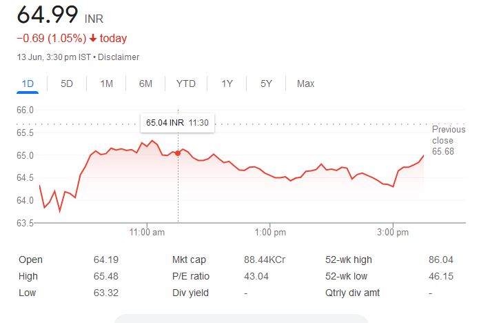 - शेयर बंद हुआ: 64.99 रुपये (-1.05%)