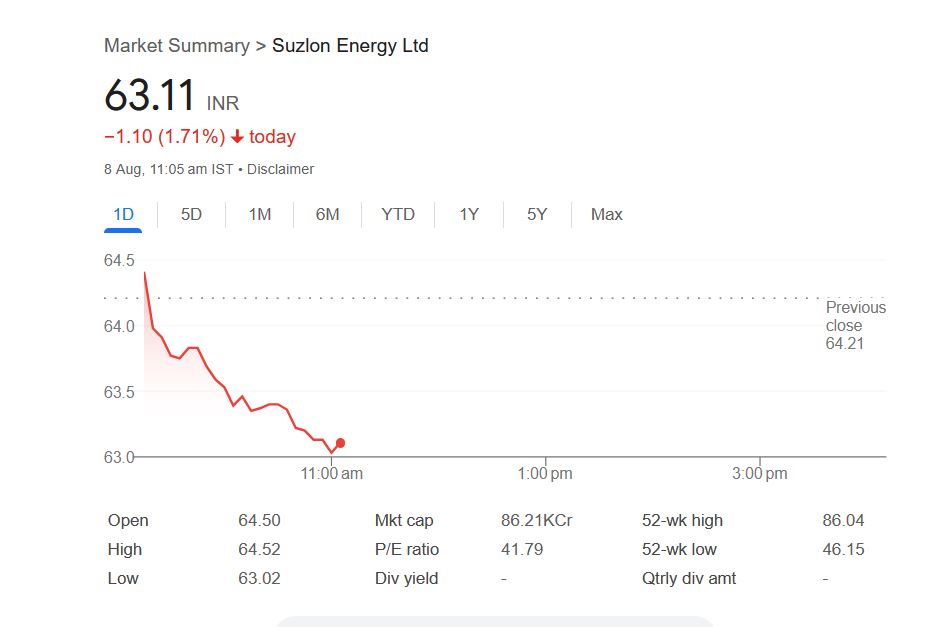 Suzlon Share Price: आज, शुक्रवार, 8 अगस्त 2025 को सुजलॉन एनर्जी लिमिटेड कंपनी का शेयर -1.71% फिसलकर 63.11 रुपये पर कारोबार कर रहा है। आज सुबह शेयर बाजार में ट्रेडिंग शुरू होते ही सुजलॉन एनर्जी शेयर 64.50 रुपये पर खुला था। आज सुबह 11:05 बजे तक सुजलॉन एनर्जी कंपनी शेयर का इंट्रा-डे हाई-लेवल 64.52 रुपये और लो-लेवल 63.3 रुपये था।