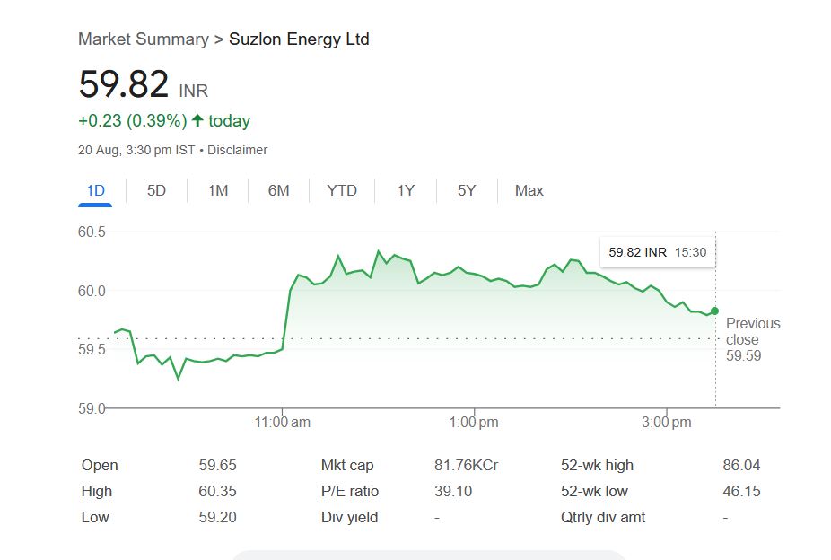Suzlon Energy Ltd – शेयर मार्केट सारांश (20 अगस्त 2025)