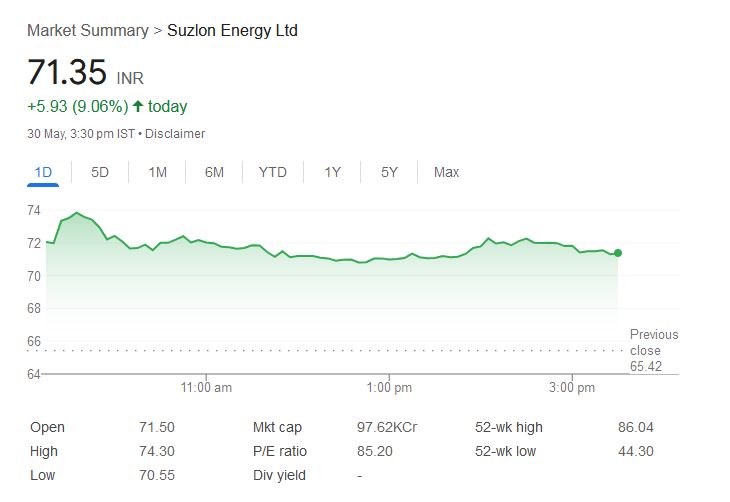 Suzlon Share Price: शुक्रवार, 30 मई 2025 को सुजलॉन एनर्जी के शेयरों में जबरदस्त उछाल देखने को मिली है। आज कंपनी के शेयरों ने 9.06% की छलांग लगाई और 71.35 रुपये पर ट्रेड कर रहा था। कारोबार की शुरुआत 71.50 रुपये से हुई और दिन के दौरान शेयर ने 74.30 रुपये के उच्चतम स्तर को छुआ, जबकि निचला स्तर 70.55 रुपये रहा। इस तेजी के पीछे कंपनी के हालिया मजबूत वित्तीय नतीजे और ब्रोकरेज फर्म की सलाह को माना जा रहा है।