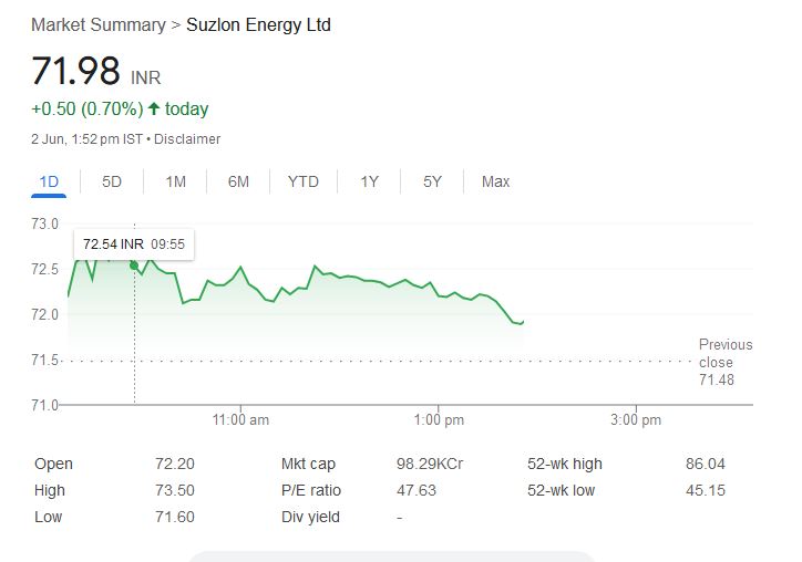 Suzlon Share Price: सोमवार, 2 जून 2025 को शेयर बाजार में उतार-चढ़ाव के बीच सुजलॉन एनर्जी लिमिटेड के शेयर मामूली उछाल के साथ 71.98 रुपये के स्तर पर ट्रेड कर रहा है। यह प्राइस इसके पिछले बंद स्तर 71.48 रुपये से 0.70% अधिक है। ट्रेडिंग की शुरुआत आज सुबह 72.20 रुपये पर हुई थी और अब तक स्टॉक 73.50 रुपये के उच्चतम तथा 71.60 रुपये के न्यूनतम स्तर को छू चुका है।