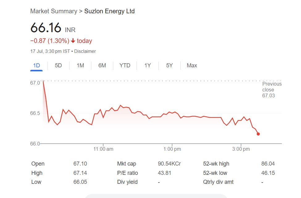 Suzlon Share Price: आज, गुरुवार, 17 जुलाई 2025 को सुजलॉन एनर्जी लिमिटेड कंपनी का शेयर 1.30 प्रतिशत फिसलकर 66.16 रुपये पर ट्रेड करते हुए बंद हुआ। गुरुवार को सुबह शेयर बाजार में कारोबार शुरू होते ही सुजलॉन एनर्जी शेयर 67.10 रुपये पर खुला था। आज दोपहर तक सुजलॉन एनर्जी कंपनी शेयर का दिन का उच्च स्तर 67.14 रुपये और निम्न स्तर 66.05 रुपये था।