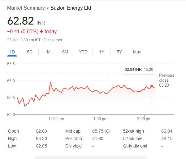 Suzlon Share Price: सोमवार, 23 जून 2025 को कारोबार के दौरान सुजलॉन एनर्जी लिमिटेड के शेयरों में हल्की गिरावट देखी गई। स्टॉक दिन के अंत में -0.65% फिसलकर 62.82 रुपये के स्तर पर बंद हुआ। ट्रेडिंग की शुरुआत 62.60 रुपये पर हुई और दिन के दौरान यह 63.20 रुपये का उच्चतम तथा 62.05 रुपये के निचले स्तर को छू गया।
