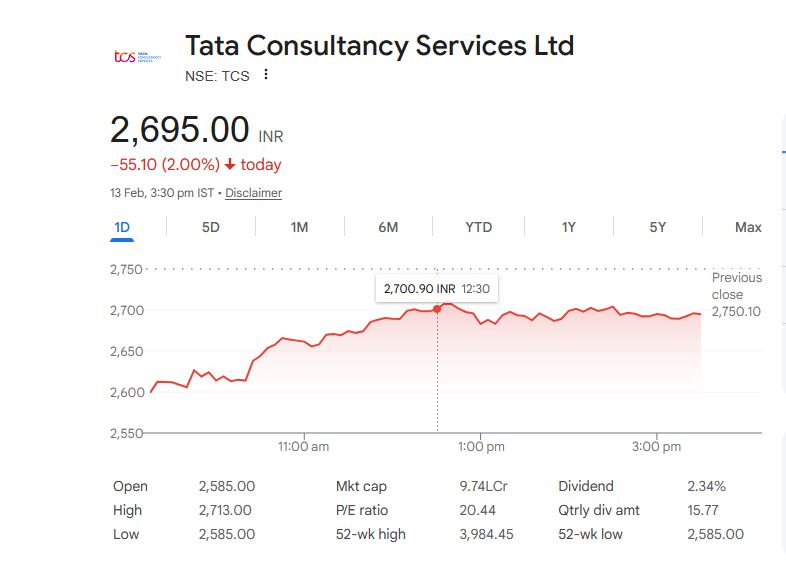 - TCS के शेयरों में 6% गिरावट – 13 फरवरी को शेयर 2,585 रुपये पर बंद।