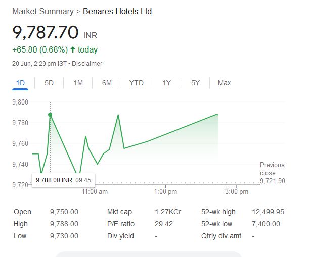 शुक्रवार, 20 जून 2025 को दोपहर 2:29 PM तक Benares Hotels Ltd के शेयरों में मजबूती देखी गई। कंपनी का शेयर 9,787.70 रुपये के स्तर पर ट्रेड कर रहा था। आज दिन के दौरान इसका हाई प्राइस 9,788.00 रुपये रहा। अगर 52 हफ्तों की बात करें, तो कंपनी का शेयर इस दौरान 12,499.95 रुपये के उच्चतम स्तर और 7,400.00 रुपये के न्यूनतम स्तर को छू चुका है।