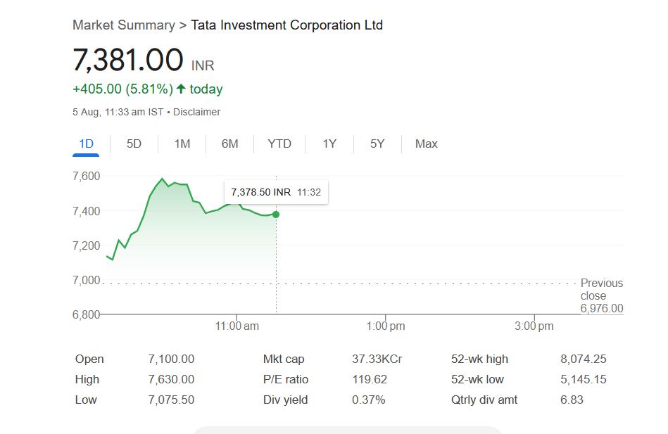 दरअसल, मंगलवार 5 अगस्त को बीएसई पर टाटा इनवेस्टमेंट कॉरपोरेशन कंपनी के शेयर 7% से अधिक उछलकर 7630 रुपये के स्तर पर जा पहुंचा। वहीं, टाटा इनवेस्टमेंट अब अपने एक शेयर को 1:10 के अनुपात में बांटने जा रही है, यानी एक शेयर को दस हिस्सों में विभाजित किया जाएगा। इससे रिटेल निवेशकों को शेयर खरीदने का सुनहरा मौका मिल सकता है। लेकिन, कंपनी ने अभी रिकॉर्ड डेट का ऐलान नहीं किया है।