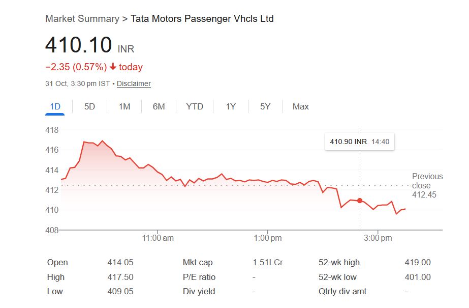 टाटा मोटर्स पैसेंजर यूनिट के शेयर बीएसई में 414.05 रुपये पर खुले। दिन में शेयर का इंट्रा-डे हाई 417.50 रुपये तक पहुंचा। हालांकि, दिन के अंत में शेयर 410.10 रुपये पर बंद हुआ, जिससे हल्की नरमी देखने को मिली।