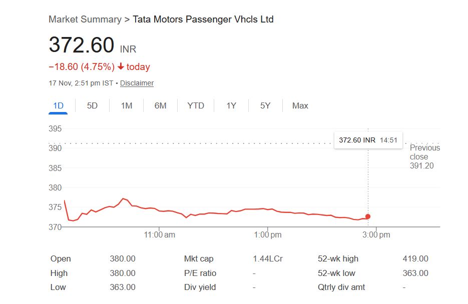 - टाटा मोटर्स पीवी का शेयर आज 7% से अधिक गिरकर ₹372.60 पर पहुंच गया।