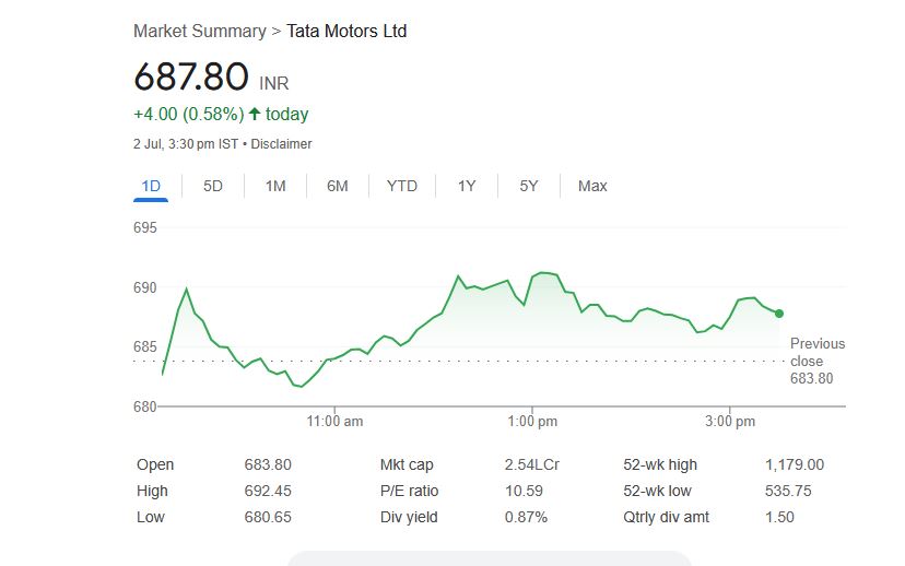 TATA Motors Share Price: आज, बुधवार, 2 जुलाई 2025 को भारतीय शेयर बाजार में गिरावट देखने को मिली। जिसके बावजूद टाटा मोटर्स लिमिटेड कंपनी का शेयर 0.58% उछलकर 687.80 रुपये पर कारोबार करते हुए बाजार बंद हुआ। बुधवार को सुबह शेयर बाजार में कारोबार शुरू होते ही टाटा मोटर्स शेयर 683.80 रुपये पर खुला था। जो आज दोपहर 3:30 PM तक टाटा मोटर्स कंपनी शेयर का हाई-लेवल 692.45 रुपये और लो-लेवल 680.65 रुपये था।