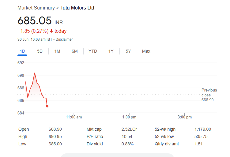 सोमवार, 30 जून 2025 को सुबह 10:03 AM तक टाटा मोटर्स लिमिटेड के शेयरों में भी नकारात्मक मूवमेंट देखा गया। कंपनी का शेयर 0.27% गिरकर 685.05 रुपये पर ट्रेड कर रहा था। इस दिन कारोबार की शुरुआत 688.90 रुपये से हुई थी और सुबह 10:03 बजे तक शेयर 690.95 रुपये के उच्चतम स्तर और 685 रुपये के निचले स्तर के बीच ट्रेड करता नजर आ रहा था।