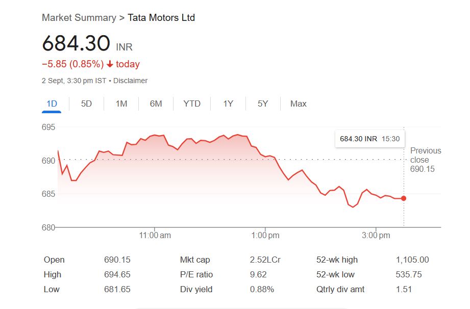 आज मंगलवार, 2 सितंबर 2025 को टाटा मोटर्स लिमिटेड कंपनी के शेयर 0.85% की गिरावट के साथ 684.30 रुपये पर बंद हुआ। आज सुबह स्टॉक मार्केट में ट्रेडिंग शुरू होते ही टाटा मोटर्स शेयर 690.15 रुपये पर ओपन हुआ था। जो आज दोपहर 3.30 बजे तक टाटा मोटर्स कंपनी के शेयर ने दिन के 694.65 रुपये के इंट्रा डे हाई लेवल को छुआ। वहीं, मंगलवार को शेयर का लो-लेवल 681.65 रुपये था।