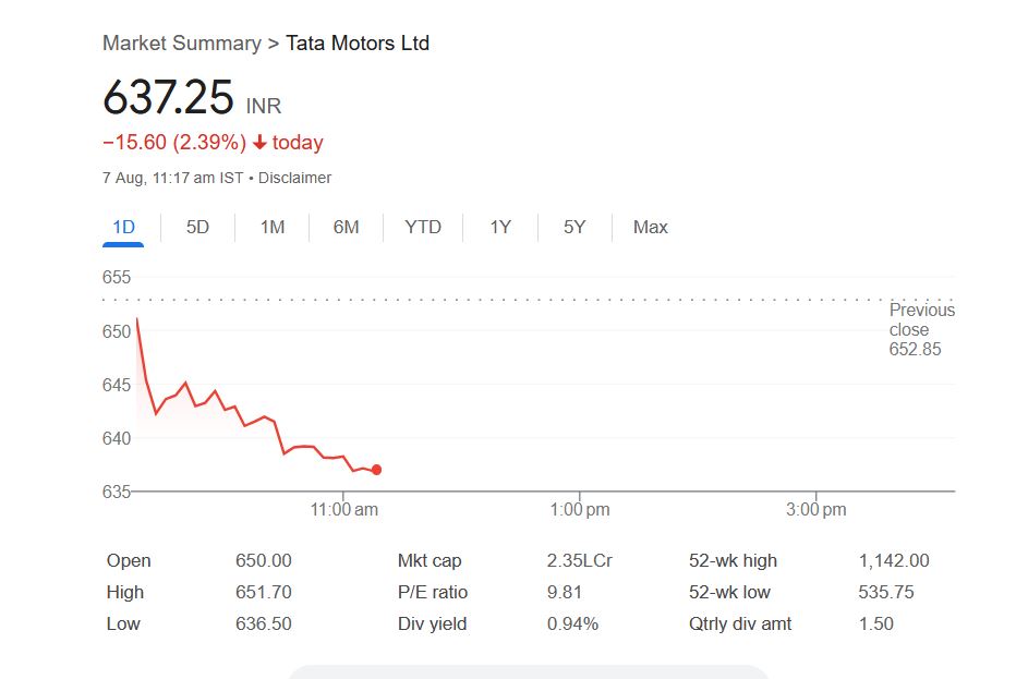 Tata Motors Share Price: गुरुवार, 7 अगस्त 2025 के दिन सेंसेक्स-निफ्टी में उतार-चढ़ाव के बीच टाटा मोटर्स लिमिटेड कंपनी का शेयर 637.25 रुपये पर कारोबार कर रहा हैं। पिछला क्लोजिंग प्राइस 652.85 रुपये के स्तर से शेयर 2.39% की गिरावट के साथ ट्रेड कर रहा हैं। आज सुबह शेयर मार्केट में ट्रेडिंग शुरू होते ही टाटा मोटर्स शेयर 650 रुपये पर खुला था। आज सुबह 11.17 बजे तक टाटा मोटर्स कंपनी शेयर ने दिन का 651.70 रुपये के इंट्रा डे हाई लेवल को छुआ। वहीं, गुरुवार को शेयर का लो-लेवल 640.55 रुपये था।