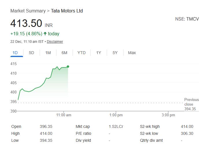 - टाटा मोटर्स (CV) का शेयर इंट्रा-डे हाई 414 रुपये पर पहुंचा।