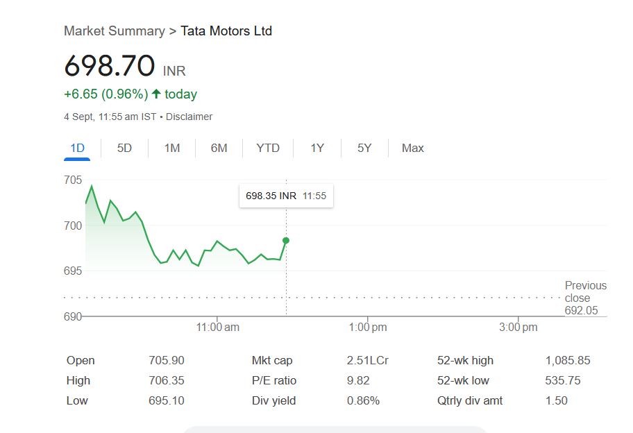 tata motors share price: आज गुरुवार, 4 सितंबर को टाटा मोटर्स के शेयर में तेजी देखने को मिली। बीएसई पर शेयर 2% उछलकर दिन के उच्चतम स्तर 706.35 रुपये पर पहुंच गया, जबकि पिछला क्लोजिंग स्तर 692.05 रुपये था। सुबह 11:55 बजे तक यह शेयर 0.96% की बढ़ोतरी के साथ 698.70 रुपये पर कारोबार कर रहा था।