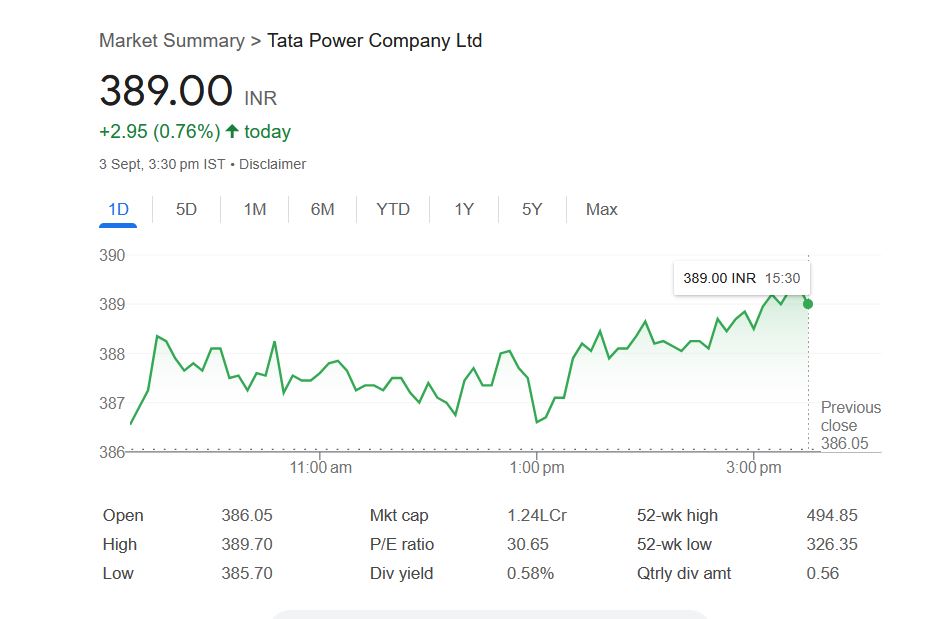 - टाटा पावर शेयर आज ₹389.00 पर बंद, दिन का हाई ₹389.70