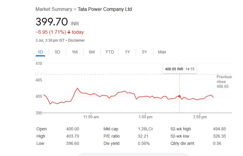 आज, गुरुवार, 3 जुलाई 2025 को टाटा पावर कंपनी लिमिटेड कंपनी का शेयर -1.57% फिसलकर 400.35 रुपये पर ट्रेड कर रहा था। आज सुबह शेयर बाजार में ट्रेडिंग शुरू होते ही टाटा पावर शेयर 400 रुपये पर ओपन हुआ था। जो दोपहर 3.46 PM तक 403.70 रुपये के हाई लेवल और 396.60 रुपये के लो लेवल को टच किया।