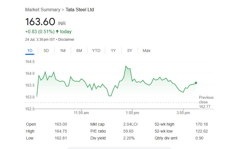 TATA Steel Share Price: गुरुवार, 24 जुलाई 2025 के दिन टाटा स्टील लिमिटेड कंपनी का शेयर 0.51 प्रतिशत उछलकर 163.60 रुपये पर कारोबार कर रहा है। आज सुबह शेयर बाजार में ट्रेडिंग शुरू होते ही टाटा स्टील शेयर 163 रुपये पर खुला था जो आज दोपहर तक टाटा स्टील कंपनी शेयर का हाई-लेवल 164.75 रुपये और लो-लेवल 162.81 रुपये था।