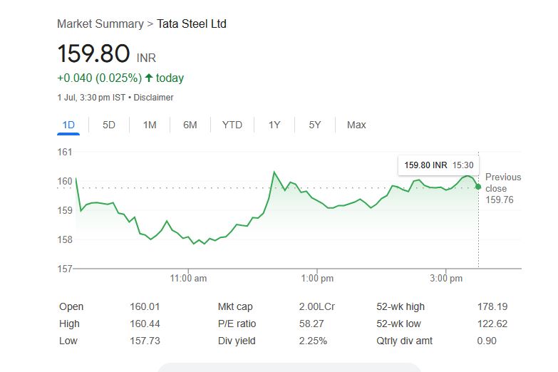 - टाटा स्टील का शेयर मंगलवार को 0.025% बढ़कर ₹159.80 पर बंद हुआ।