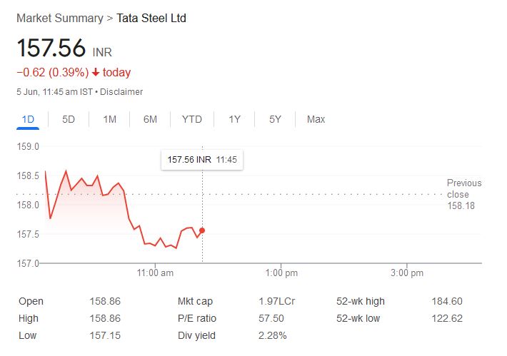 - टाटा स्टील का शेयर आज 0.39% फिसलकर 157.56 रुपये पर पहुंचा