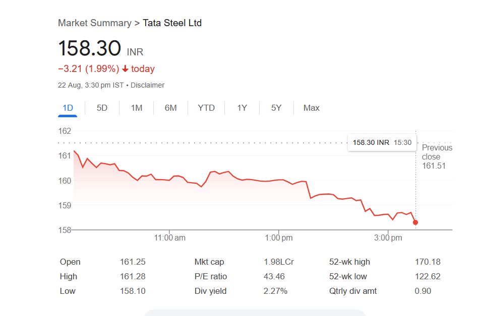 शुक्रवार, 22 अगस्त 2025 को दोपहर 3.30 बजे तक टाटा स्टील लिमिटेड कंपनी के स्टॉक में 1.99% की गिरावट के साथ 158.30 रुपये पर बंद हुआ था। शुक्रवार को सुबह ओपनिंग बेल पर ट्रेडिंग शुरू होते ही टाटा स्टील कंपनी के शेयर 161.25 रुपये पर खुला था और दोपहर 3.30 बजे तक टाटा स्टील कंपनी शेयर 161.28 रुपये के इंट्रा-डे हाई लेवल तक पहुंच गया था। वहीं, शुक्रवार को इस शेयर का लो लेवल 158.10 रुपये था।