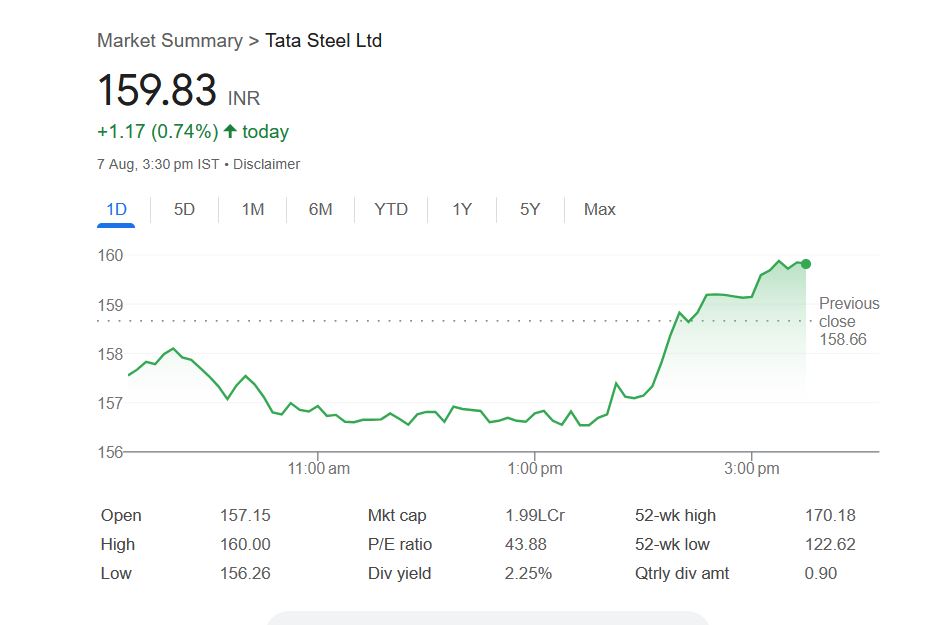 Tata Steel Share Price: आज, गुरुवार, 7 अगस्त 2025 को टाटा स्टील लिमिटेड कंपनी का शेयर 0.74% की तेजी के साथ 159.83 रुपये पर कारोबार कर रहा है। आज सुबह शेयर बाजार में ट्रेडिंग शुरू होते ही टाटा स्टील शेयर 157.15 रुपये पर बाजार में ओपन हुआ था। जो आज दोपहर 3.30 बजे तक टाटा स्टील कंपनी शेयर का इंट्रा डे हाई-लेवल 160 रुपये और लो-लेवल 156.26 रुपये था।