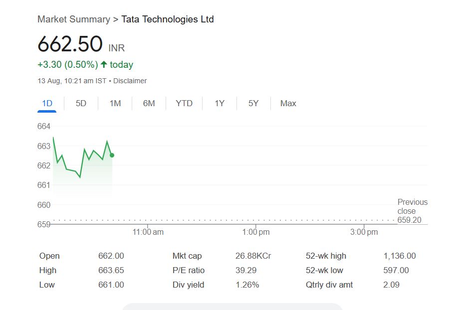 आज, बुधवार, 13 अगस्त 2025 के दिन टाटा टेक्नोलॉजीज लिमिटेड कंपनी के शेयर 0.50% की बढ़ोतरी के साथ 662.50 रुपये पर ट्रेड कर रहा है। आज सुबह शेयर मार्केट में ट्रेडिंग शुरू होते ही टाटा टेक्नोलॉजीज के शेयर 662 रुपये पर खुला था। जो सुबह 10:21 बजे तक टाटा टेक्नोलॉजीज कंपनी के शेयर ने 663.65 रुपये के इंट्रा-डे हाई लेवल को छुआ। वहीं, आज शेयर का लो-लेवल 661 रुपये था।