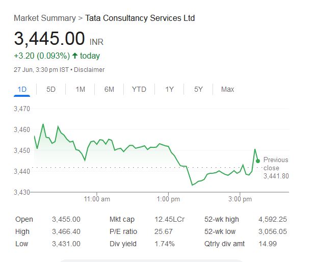 शुक्रवार, 27 जून 2025 को TCS का शेयर बीएसई पर 3,445 रुपये के स्तर पर बंद हुआ। कंपनी का मौजूदा मार्केट कैप 12.45 लाख करोड़ रुपये है। पिछले 6 महीनों में शेयर 17% टूट चुका है, जबकि 3 महीने में इसमें 6% की नरमी रही है। मार्च 2025 के आखिरी तक प्रमोटर ग्रुप के पास कंपनी की 71.77% हिस्सेदारी थी।
