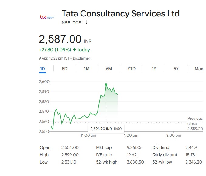 - NSE पर TCS शेयर ₹2,587 पर, 1.09% की हल्की बढ़त।
