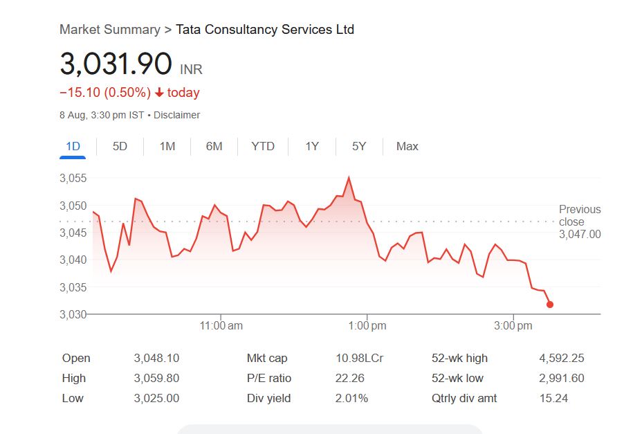 - TCS का शेयर शुक्रवार को 0.50% गिरकर ₹3031.90 पर बंद हुआ।