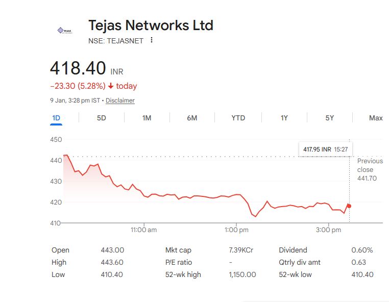 Tejas Networks Ltd शेयर का आज का हाल (9 जनवरी 2026)