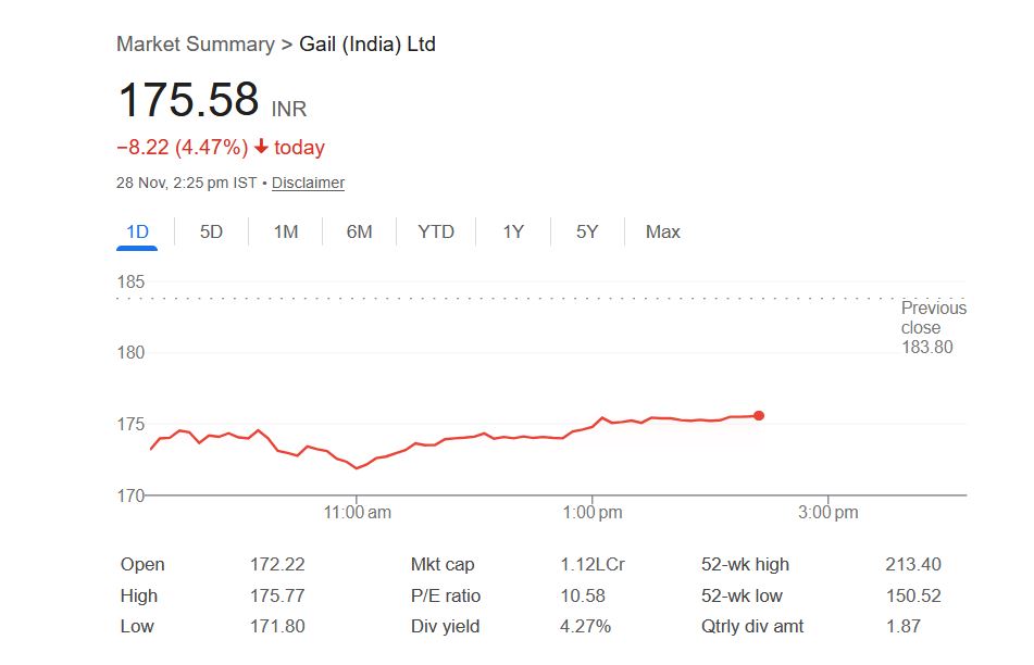 शुक्रवार को ट्रेडिंग की शुरुआत गेल के शेयर 6.5% गिरावट के साथ 172.22 रुपये पर हुई। दिन के दौरान शेयर और फिसलकर 171.80 रुपये के इंट्रा-डे लो लेवल तक पहुंच गया। कंपनी के शेयरों में दबाव बरकरार रहा और तेजी की उम्मीदों के बीच गिरावट ने निवेशकों को चौंका दिया।