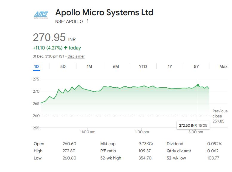 नवीनतम ऑर्डर की खबर के बाद अपोलो माइक्रो सिस्टम्स का शेयर बीएसई पर 272.80 रुपये तक पहुंच गया, जिससे दो दिन की गिरावट रुक गई। इस साल अब तक (YTD) शेयर में 124% की बढ़त, पिछले एक साल में 134% की वृद्धि और पिछले पांच वर्षों में 2079% का जबरदस्त रिटर्न दर्ज किया गया।