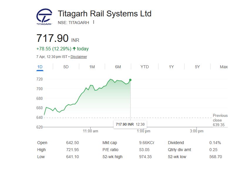 नई दिल्ली: Titagarh Rail Systems Share Price: आज मंगलवार को टीटागढ़ रेल सिस्टम के शेयर में जबरदस्त तेजी देखने को मिली है। आज सुबह स्टॉक 642.50 रुपये पर खुला और दिन के दौरान 12 प्रतिशत से अधिक चढ़कर 721.95 रुपये के इंट्रा-डे हाई तक पहुंच गया। हाल के दिनों में भी शेयर ने अच्छा प्रदर्शन किया है, जिससे निवेशकों का भरोसा मजबूत हुआ है। बाजार में इस तेजी ने खासा ध्यान खींचा है।
